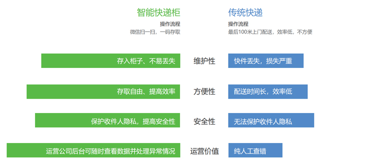 智能快递柜不同于传统的快递收发方式,用户无法领取快递时,快递员可将快递存入快递柜,用户可随时来取;当多人同时领取快递时,用户不用再排队,领取快递更加自由。